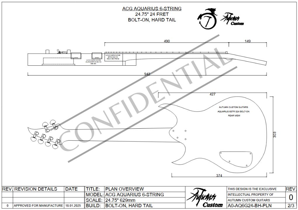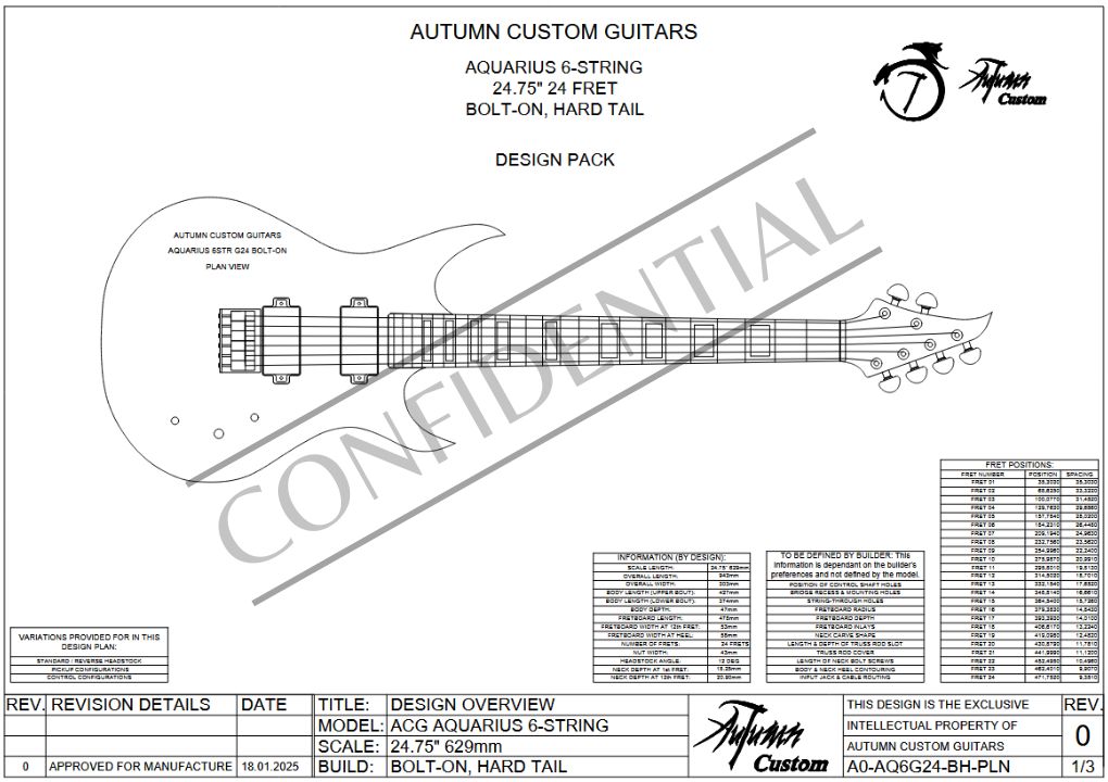 The design is also further customizable, as any other 24.75″ 24 fret fretboard and headstock outline from our other designs will fit perfectly into this model’s neck pocket. Take note that the actual neck thicknesses and heels differ between models, so ensure that if you combine an actual neck from another model (not just the fretboard and headstock outline), that it is the same neck between both models.