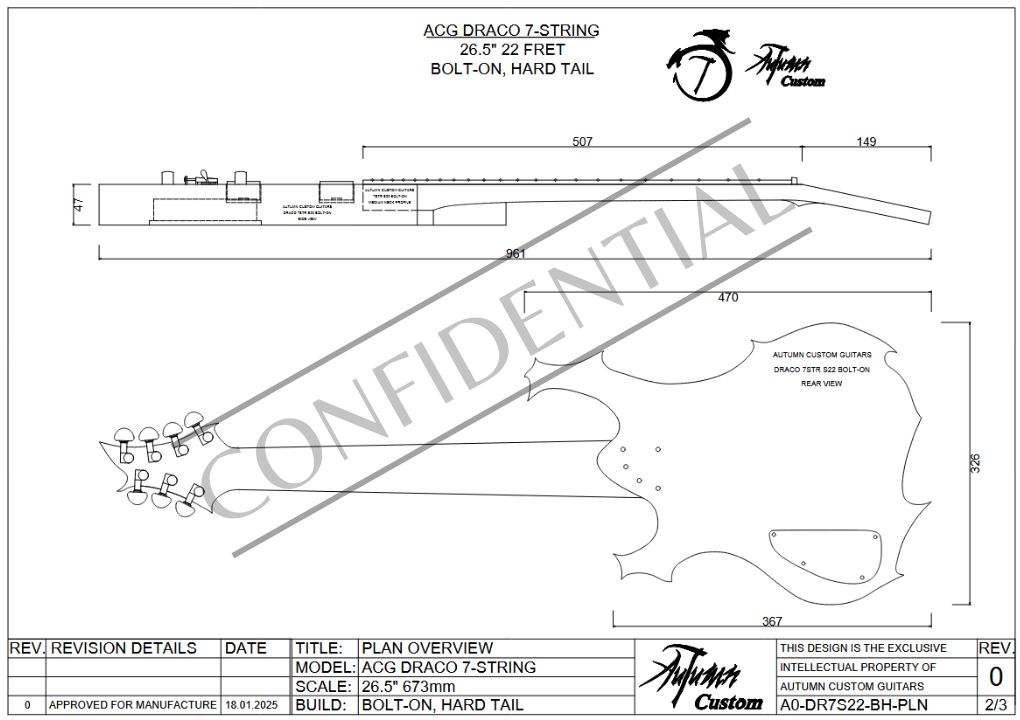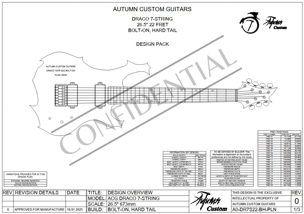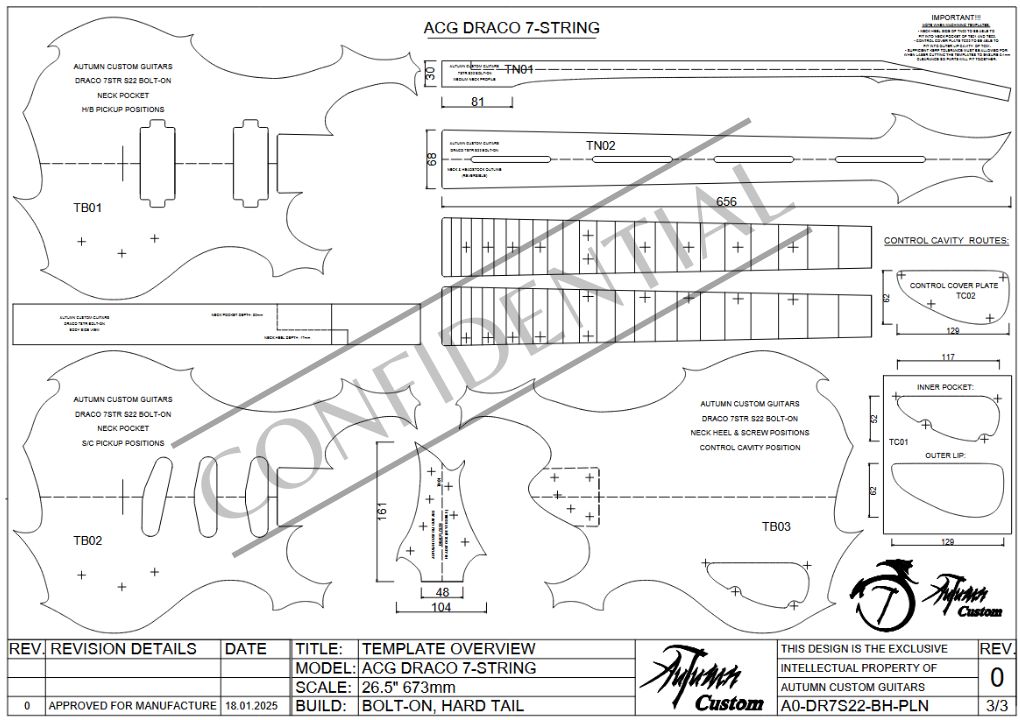 The design is also further customizable, as any other 7 string 26.5″ 22 fret fretboard and headstock outline from our other designs will fit perfectly into this model’s neck pocket. Take note that the actual neck thicknesses and heels differ between models, so ensure that if you combine an actual neck from another model (not just the fretboard and headstock outline), that it is the same neck between both models.