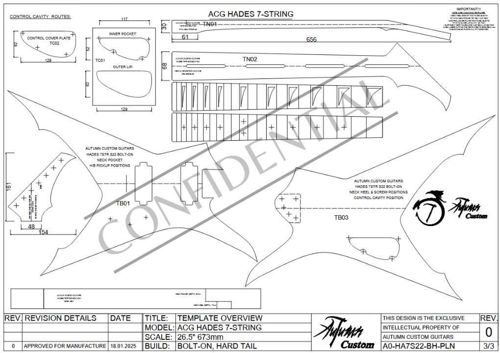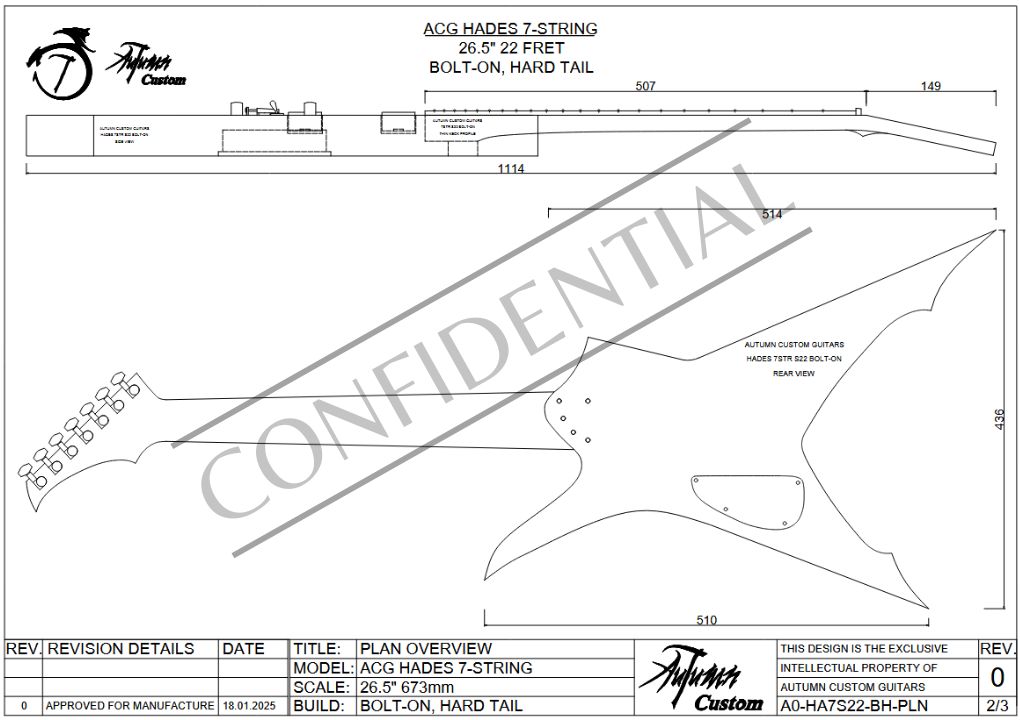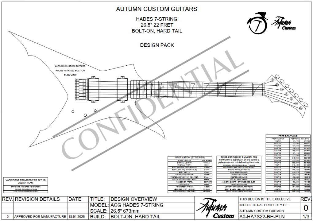 The design is also further customizable, as any other 7 string 26.5″ 22 fret fretboard and headstock outline from our other designs will fit perfectly into this model’s neck pocket. Take note that the actual neck thicknesses and heels differ between models, so ensure that if you combine an actual neck from another model (not just the fretboard and headstock outline), that it is the same neck between both models.