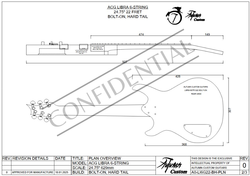 The design is also further customizable, as any other 24.75″ 22 fret fretboard and headstock outline from our other designs will fit perfectly into this model’s neck pocket. Take note that the actual neck thicknesses and heels differ between models, so ensure that if you combine an actual neck from another model (not just the fretboard and headstock outline), that it is the same neck between both models.