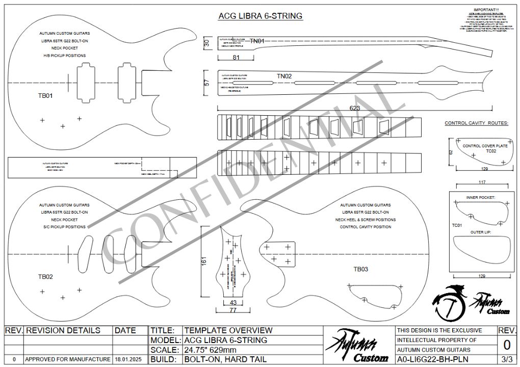 Full scale double cutaway electric guitar building luthier blueprint. Build your own custom guitar with this great digital guitar plan. Make your own templates with the included drawings or use the 2D CAD file for CNC or laser cutting.