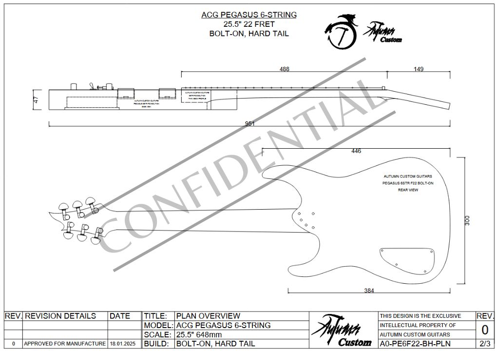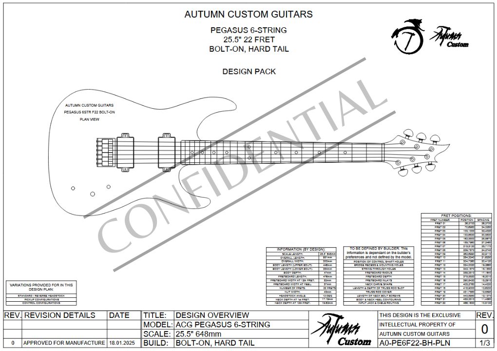 The design is also further customizable, as any other 25.5″ 22 fret fretboard and headstock outline from our other designs will fit perfectly into this model’s neck pocket. Take note that the actual neck thicknesses and heels differ between models, so ensure that if you combine an actual neck from another model (not just the fretboard and headstock outline), that it is the same neck between both models.