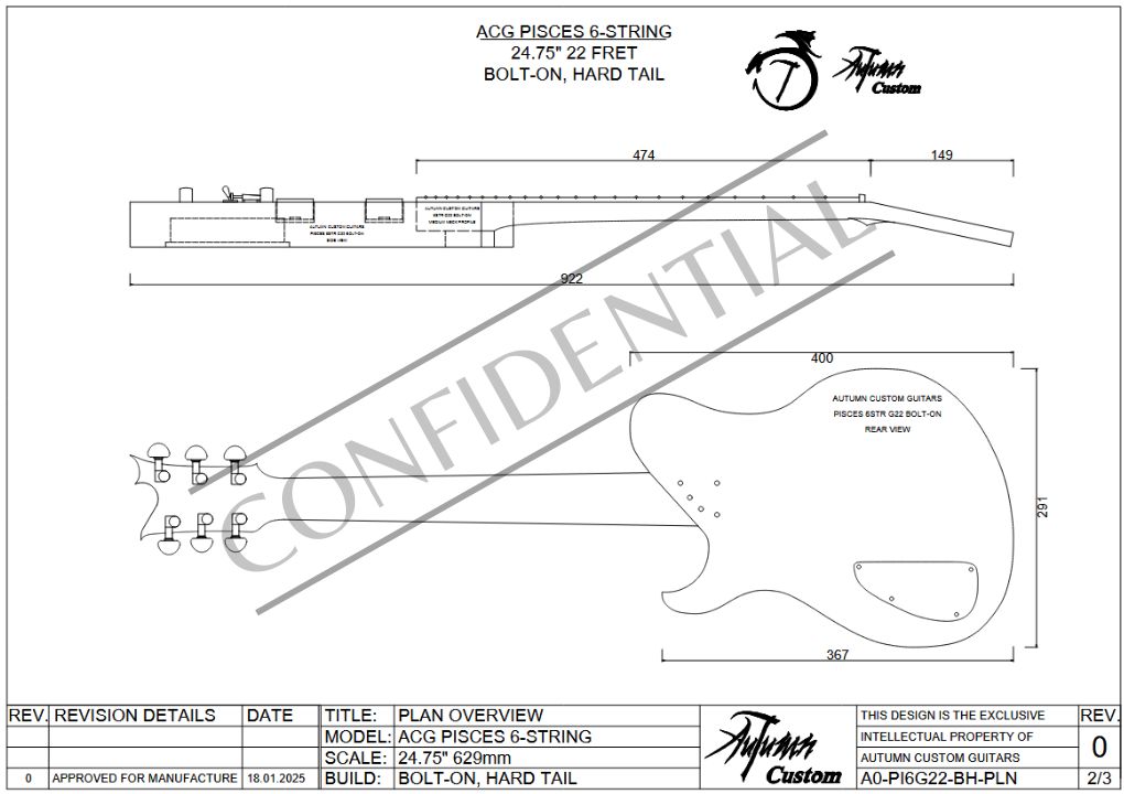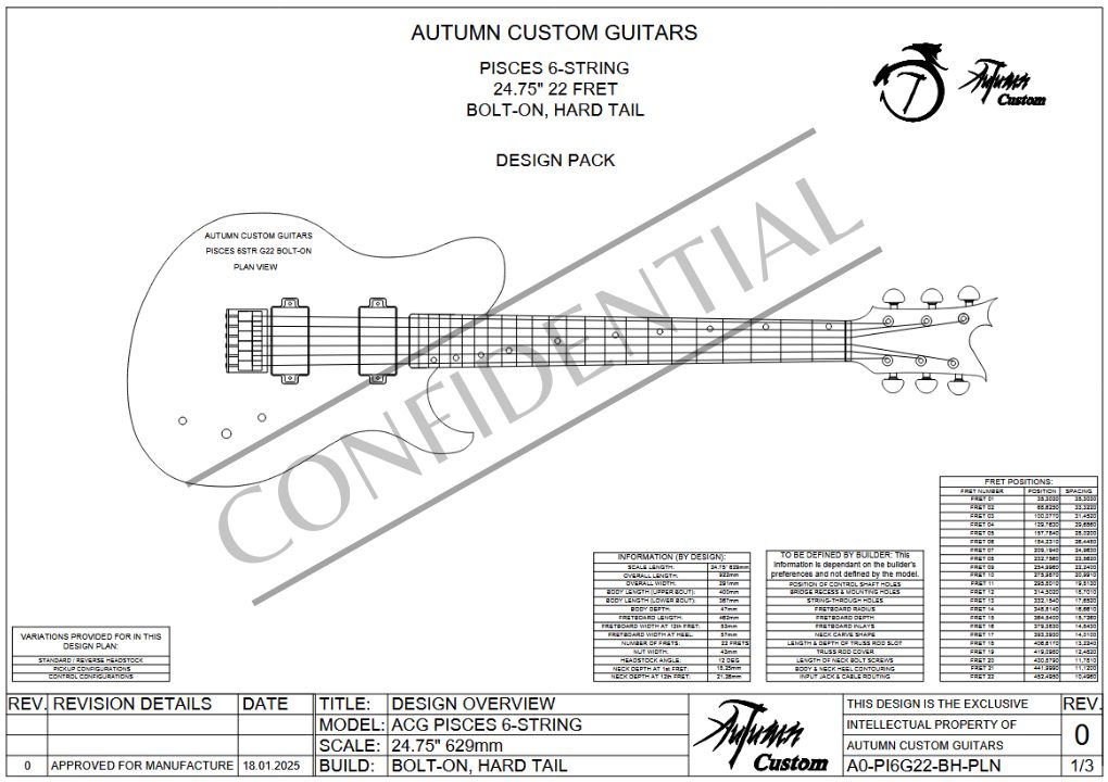 The design is also further customizable, as any other 24.75″ 22 fret fretboard and headstock outline from our other designs will fit perfectly into this model’s neck pocket. Take note that the actual neck thicknesses and heels differ between models, so ensure that if you combine an actual neck from another model (not just the fretboard and headstock outline), that it is the same neck between both models.