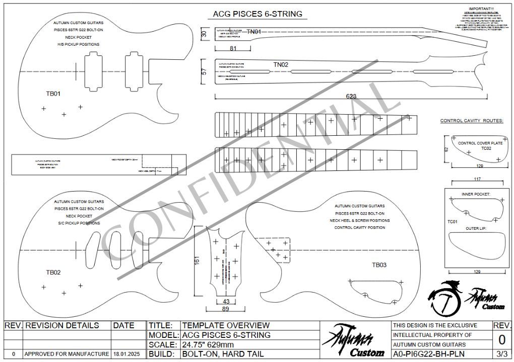 Full scale single cutaway electric guitar building luthier blueprint. Build your own custom guitar with this great digital guitar plan. Make your own templates with the included drawings or use the 2D CAD file for CNC or laser cutting.