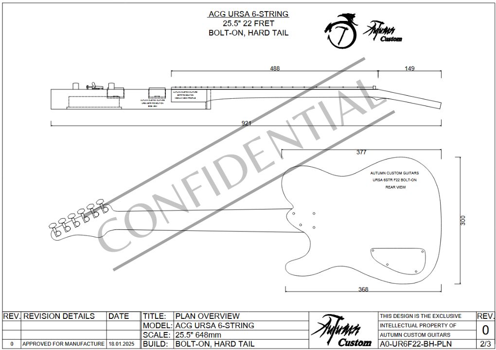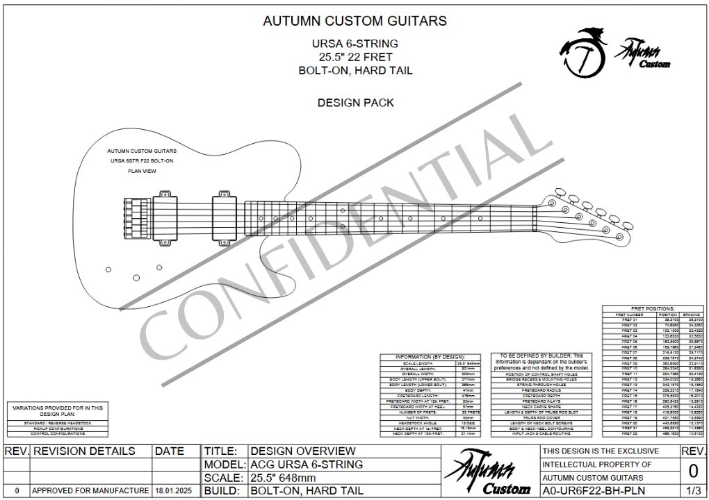 The design is also further customizable, as any other 25.5″ 22 fret fretboard and headstock outline from our other designs will fit perfectly into this model’s neck pocket. Take note that the actual neck thicknesses and heels differ between models, so ensure that if you combine an actual neck from another model (not just the fretboard and headstock outline), that it is the same neck between both models.